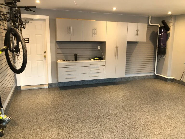 - Finished floor and new with polyaspartic coating in a domino flake colour;