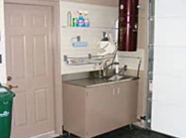 - Included a work area for husband to tinker, cabinets for golf club storage, cabinets to contain garbage so that you could slide top doors to deposit garbage and front doors to pull out bags for disposal, open cabinets for recycling and storage, wet station with stainless steel surface