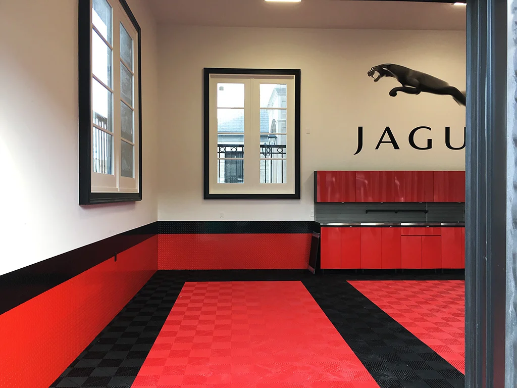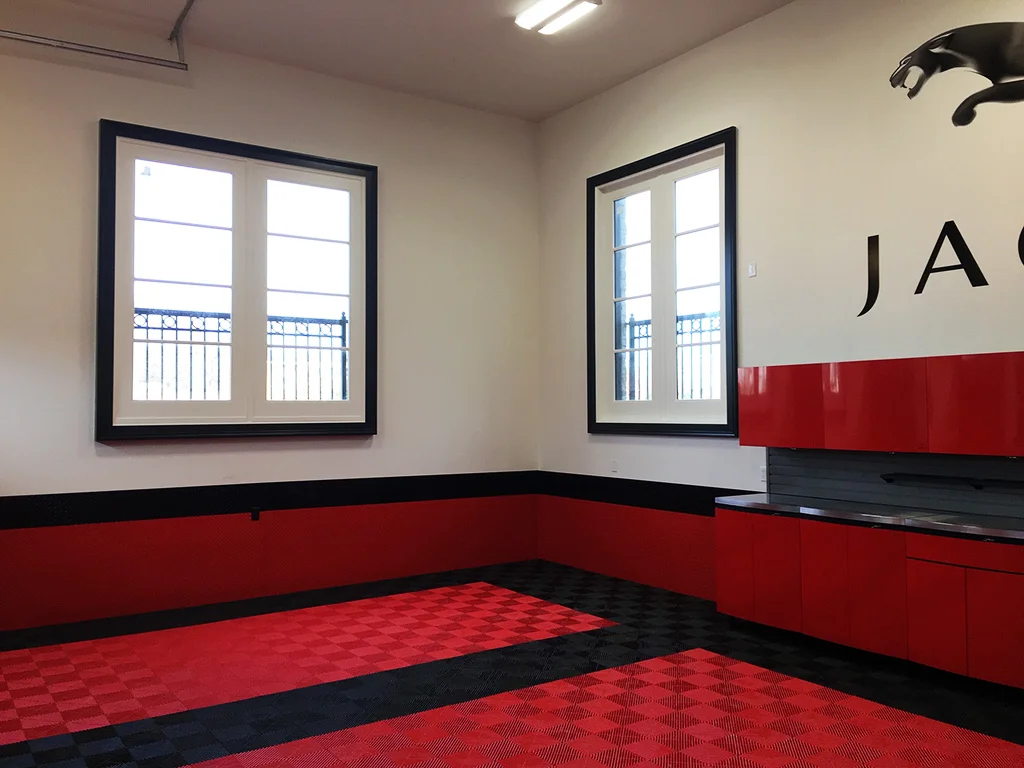 Starting with the garage floor, of course, the garage owner wanted to create a sporty car finish so we looked to the Swisstrax Ribtrax garage floor tiles to create a black and red pattern which would give it a race car design. These tiles are sturdy enough for commercial garages and heavier vehicles. These tiles are UV protected so that even with large windows allowing natural light to feature this spectacular garage, the colours won’t fade over time.