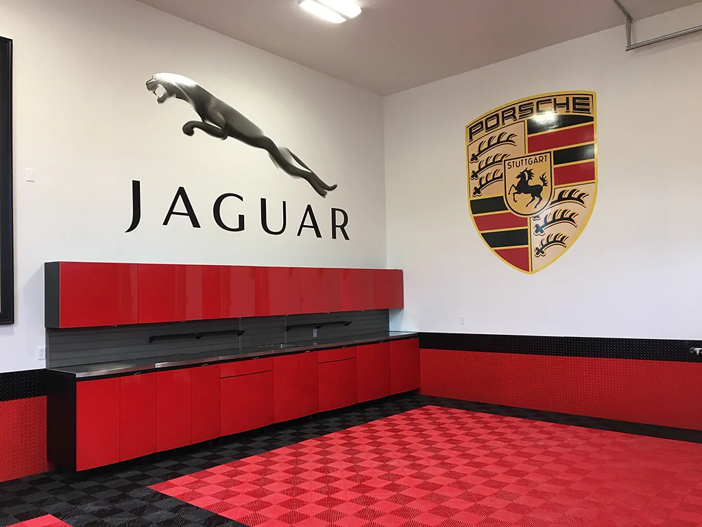 To finish the rest of the garage, the walls and ceiling were painted. The space between the upper and lower cabinets was completed with a graphite slatwall to tie the upper and lower sections together. It offers a place to hang the owner’s small objet d’arts. The aluminum checker plate acid washed sidewalls in black and red completed the look and feel of the rest of the wall space while protecting the lower portion of the walls from small nicks or dings. The rest of the wall space was finished with car Porsche and Jaguar logos.