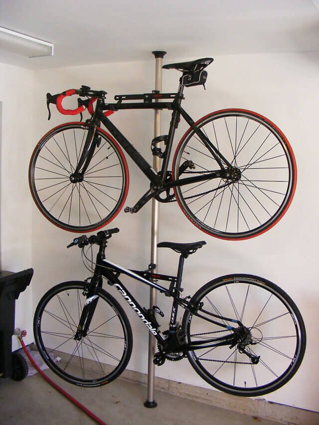 Overhead bicycle storage racks operate on a pulley system that is either manual or motorized. A two-bike pulley system stores bikes flat against the ceiling and requires minimal clearance space. The five-bike pulley system, which requires 60-inches of clearance, is designed to take advantage of the generous height of tall ceilings.