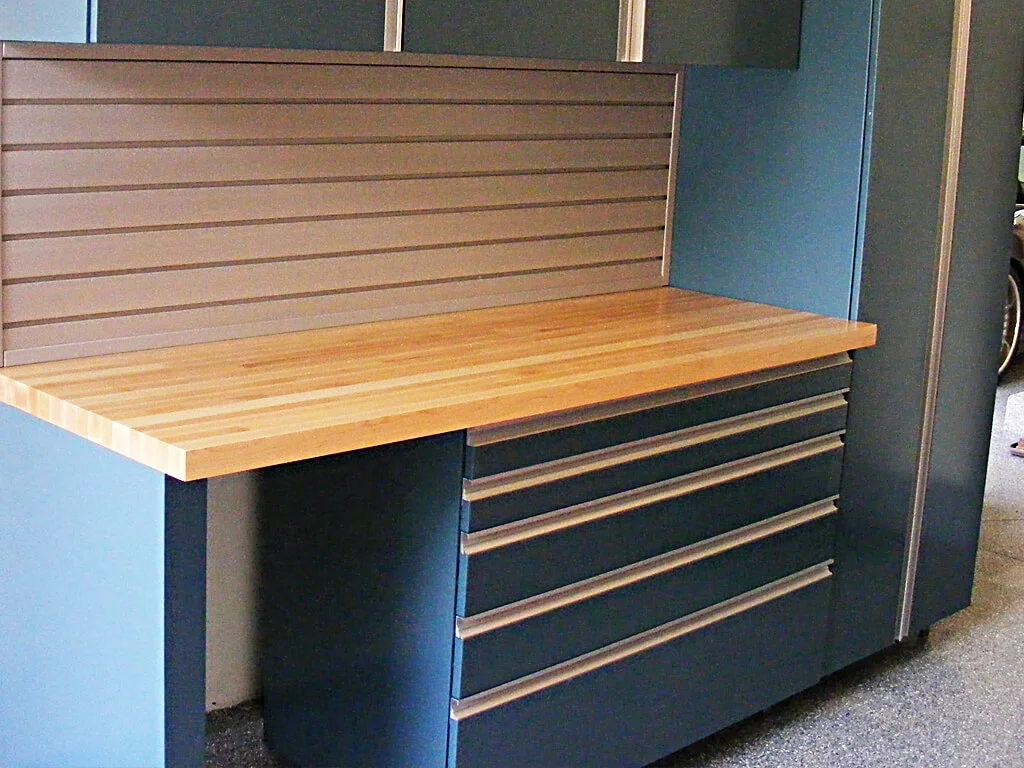 For someone who wants to work on a car in their garage, we often create a work space.  Depending on budget and space constraints, this may vary from a simple workbench made from wood to custom steel cabinets with a solid wood or stainless steel surface.  A portable workbench with lockable castors is also available.  The castors make it so you can roll your work area to where you need and then lock it in place once again so they become steady and safe to use.