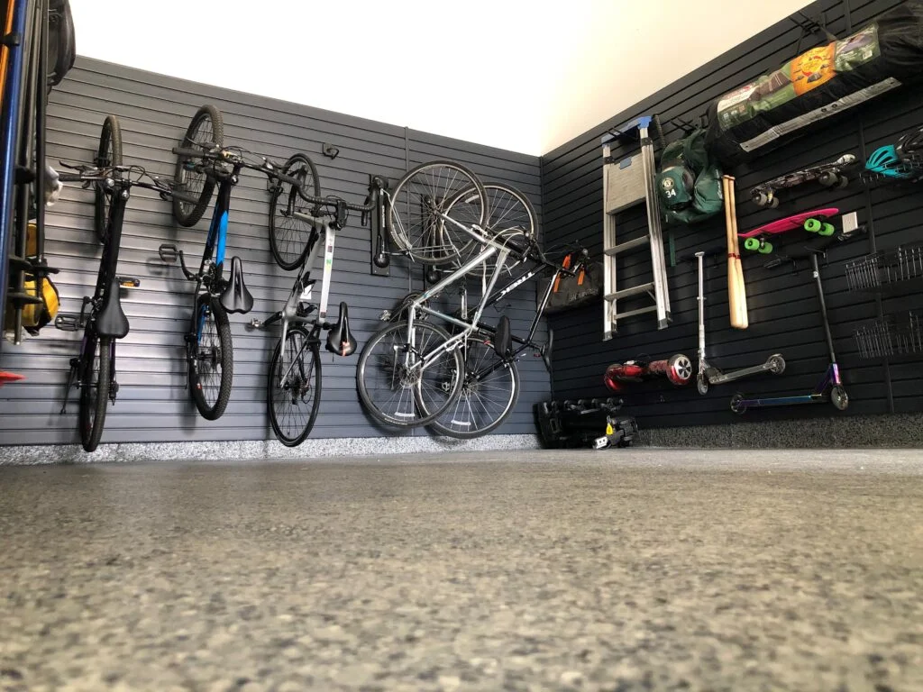 Typically, for the best storage solution we recommend that our clients store their bikes along the back wall, if possible, using a folding bike storage system from SteadyRack. The great thing about the SteadyRack system is that it can connect into our slatwall system thus allowing you to move to your bikes to a preferred location at any point in time while also allowing your bikes to be folded into the wall thus taking up minimal space. Given that this bike storage system connects into the slatwall, should you want to move them at any time its as easy as loosening two screws.