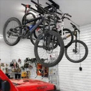 Another bike storage solution is to use an electrical hoisting system called Garage Gator. This is a great system for those that have trouble lifting their bike however it does come with the challenge that your ceiling height must be at least 11′ high and it can make your garage look untidy as generally the bikes will hang towards the middle of the garage.