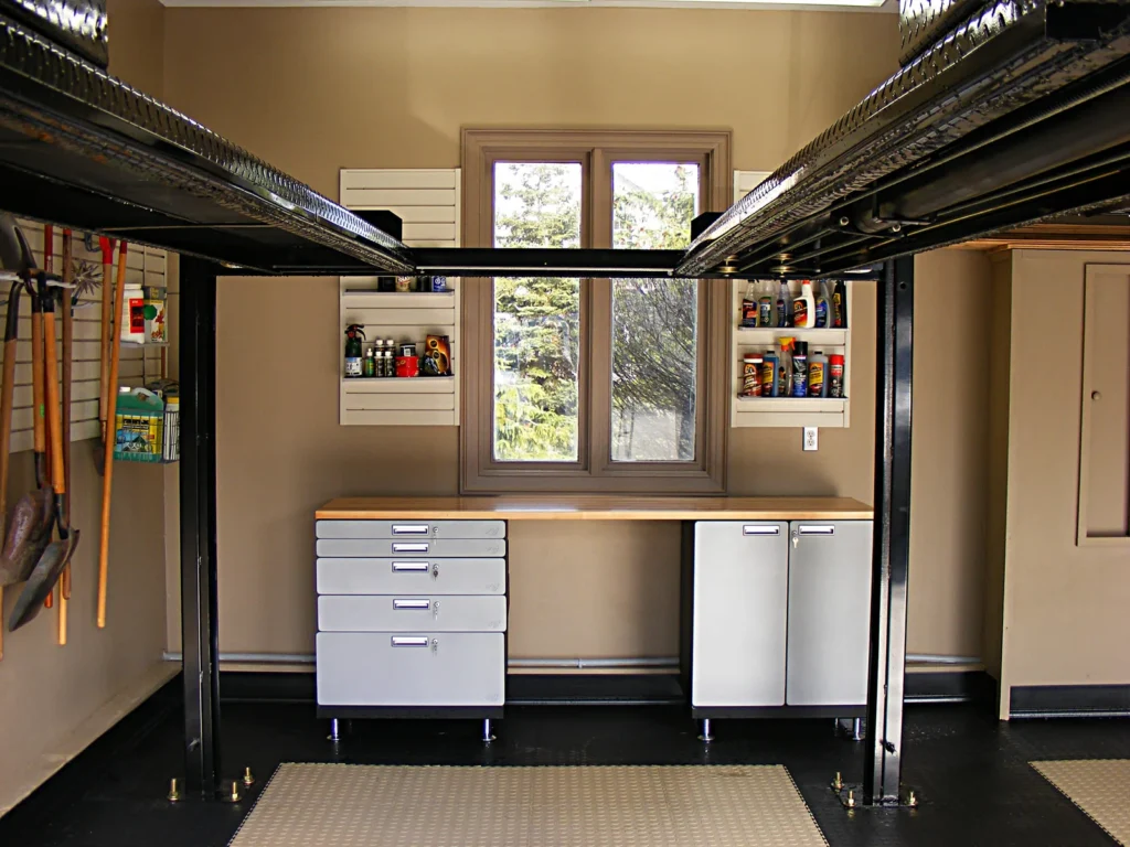 Car lifts are also a great option for people who want to work on their cars or set up a workspace underneath. Where space is an issue, one of the custom options we offer is a workstation on wheels that fits neatly in a corner when you’re not using it, but can be moved into the middle of the garage when you need it.