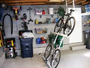 - Baskets, hooks and shelves can be hung at various points along the wall organization system panels to store bicycle helmets, water bottles and other equipment.