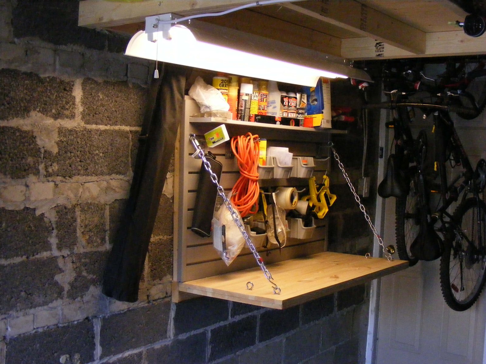 Workbench for One Car GarageIf you’re a gardener, car-enthusiast or DIYer, a workbench is a nice addition to any garage. Workbenches can be designed to any size or shape. A workbench that folds up to be stored when you aren’t using it is a great space-saver for small garages.
