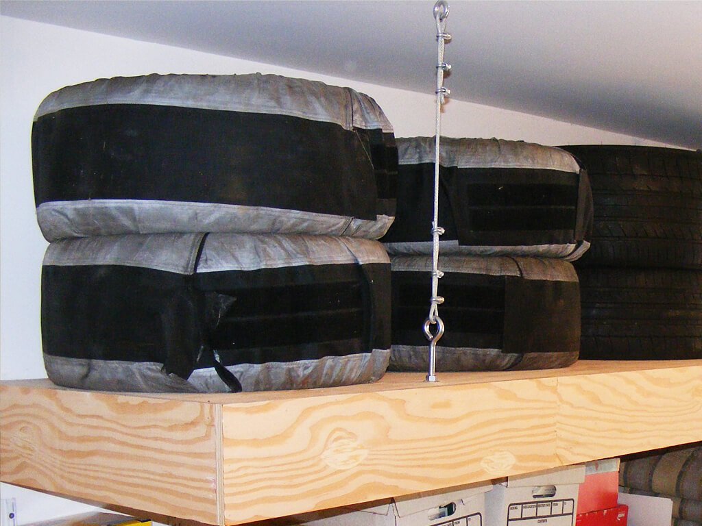 tire storage solutions - custom overhead tire storage platformJust as automobiles come with a variety of options and price points—so does garage organization. Organizing your garage can be as simple as creating task-related zones, installing pegboard for tool storage and repurposing or upcycling an old table for a workspace. For a more flexible option and a sophisticated look, a wall organization system is ideal.
